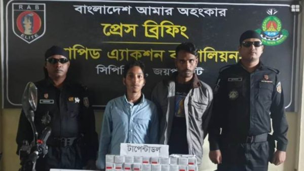 নওগাঁ জেলার বদলগাছীতে চার হাজার পিস নেশা জাতীয় টাপেন্টাডল ট্যাবলেটসহ দুই যুবককে গ্রেফতার করেছে র‌্যাপিড অ্যাকশন ব্যাটালিয়ন (র‌্যাব-৫) জয়পুরহাট ক্যাম্পের সদস্যরা। ২৬ নভেম্বর,শনিবার সকালে র‌্যাব-৫ থেকে এক সংবাদ বিজ্ঞপ্তিতে এ তথ্য জানানো হয়। গতকাল শুক্রবার (২৫ নভেম্বর) রাতে বদলগাছী উপজেলার গোবরচাঁপা বাজার এলাকায় অভিযান পরিচালনা করে তাদের গ্রেফতার করে র্যাব। গ্রেফতারকৃতরা হলেন, বদলগাছী উপজেলার মথুরাপুর ইউপির থুপশহর গ্রামের আজাহার আলীর ছেলে সুমন হোসেন (২৫) ও পিন্টু হোসেনের ছেলে ফিরোজ হোসেন (২৬)। সংবাদ বিজ্ঞপ্তিতে জানানো হয়, গোপন সংবাদের ভিত্তিতে র‌্যাব-৫ জয়পুরহাট র‌্যাব ক্যাম্পের একটি অপারেশনাল দল কোম্পানি কমান্ডার মেজর মো. মোস্তফা জামান এবং আর্টিলারি ও সিনিয়র সহকারি পুলিশ সুপার মো. মাসুদ রানার নেতৃত্বে গোবরচাঁপা বাজার এলাকায় অভিযান পরিচালনা করা হয় । এ সময় ৪ হাজার পিস নেশা জাতীয় টাপেন্টাডল ট্যাবলেটসহ ওই দুই মাদক কারবারিকে গ্রেফতার করা হয়। গ্রেফতারের সময় তাদের কাছ থেকে ৩টি মোবাইল, ১টি মোটরসাইকেল, ৪ হাজার ৫০০ টাকা নগদ টাকা জব্দ করা হয়। সংবাদ বিজ্ঞপ্তিতে আরও জানানো হয়, গ্রেফতারকৃতদের প্রাথমিক জিজ্ঞাসাবাদ করে জানা যায়, তারা দীর্ঘদিন ধরে পরস্পরের যোগসাজশে নেশাজাতীয় মাদকদ্রব্য টাপেন্টাডল ট্যাবলেট অবৈধভাবে সংগ্রহ করে নওগাঁ জেলার বিভিন্ন এলাকায় মাদকসেবী ও মাদক কারবারিদের কাছে সরবরাহ করে আসছিলেন। তাদের বিরুদ্ধে বদলগাছী থানায় মাদকদ্রব্য নিয়ন্ত্রণ আইন-২০১৮ অনুসারে মামলা দায়ের করা হয়েছে। বদলগাছি থানার অফিসার ইনচার্জ (ওসি) আতিয়ার রহমান জানান, থানায় মামলা দায়ের শেষে গ্রেপ্তারকৃত সুমন হোসেন ও ফিরোজ হোসেনকে আদালতের মাধ্যমে নওগাঁ জেলহাজতে প্রেরণ করা হয়েছে।