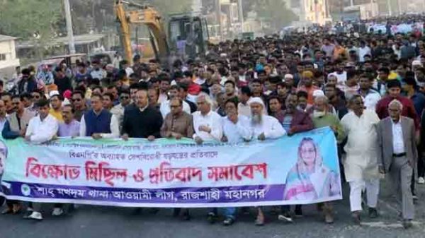 রাজশাহীতে বিএনপির অব্যাহত দেশবিরোধী ষড়যন্ত্রের প্রতিবাদে শাহ্ মখদুম থানা আওয়ামী লীগের উদ্যোগে বিক্ষোভ মিছিল ও প্রতিবাদ সমাবেশে, প্রধান অতিথি হিসেবে বক্তব্য দেন বাংলাদেশ আওয়ামী লীগের সভাপতিমণ্ডলীর সদস্য ও রাজশাহী সিটি কর্পোরেশনের মাননীয় মেয়র এ.এইচ.এম খায়রুজ্জামান লিটন। শাহ্ মখদুম থানা আওয়ামী লীগ সভাপতি আখতারুল আলমের সভাপতিত্বে বিক্ষোভ মিছিল ও প্রতিবাদ সমাবেশ বক্তব্য দেন রাজশাহী মহানগর আওয়ামী লীগ সাধারণ সম্পাদক মোঃ ডাবলু সরকার। সঞ্চালনা করেন শাহ্ মখদুম থানা আওয়ামী লীগ সাধারণ সম্পাদক ও ১৭নং ওয়ার্ড কাউন্সিলর শাহাদত আলী শাহু। কর্মসূচিতে উপস্থিত ছিলেন রাজশাহী মহানগর আওয়ামী লীগের সহ-সভাপতি বীর মুক্তিযোদ্ধা নওশের আলী, যুগ্ম সাধারণ সম্পাদক আহ্সানুল হক পিন্টু, সাংগঠনিক সম্পাদক এ্যাড. আসলাম সরকার, মীর ইসতিয়াক আহমেদ লিমন, ত্রাণ ও সমাজ কল্যান সম্পাদক ফিরোজ কবির সেন্টু, শ্রম সম্পাদক আব্দুস সোহেল, বন ও পরিবেশ বিষয়ক সম্পাদক রবিউল আলম রবি, তথ্য ও গবেষণা বিষয়ক সম্পাদক জিয়া হাসান আজাদ হিমেল, উপ-প্রচার সম্পাদক সিদ্দিক আলম, সদস্য জহির উদ্দিন তেতু, শাহাব উদ্দিন, আশরাফ উদ্দিন খান, ইসমাইল হোসেন, মজিবুর রহমান, সৈয়দ মন্তাজ আহমেদ, বাদশা শেখ, থানা আওয়ামী লীগের মধ্যে বোয়ালিয়া (পশ্চিম) থানার সাধারণ সম্পাদক শামসুজ্জামান রতন, মতিহার থানার সাধারণ সম্পাদক আলাউদ্দিন, মহানগর শ্রমিক লীগের ভারপ্রাপ্ত সভাপতি ওয়ালী খান, ভারপ্রাপ্ত সাধারণ সম্পাদক শরীফ আলী মুনমুন, মহানগর যুবলীগের সভাপতি রমজান আলী, মহানগর স্বেচ্ছাসেবক লীগ সাধারণ সম্পদাক জেডু সরকার, মহানগর ছাত্রলীগ সভাপতি নূর মোহাম্মদ সিয়াম সহ নেতৃবৃন্দ।