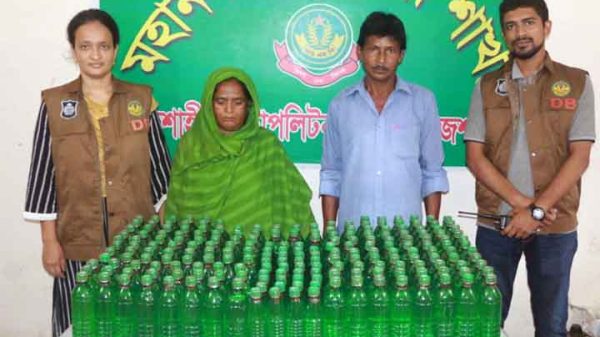 গ্রেফতারকৃতরা হলো: রাজপাড়া থানার লক্ষীপুর বাকীর মোড় ডোমপাড়া এলাকার মৃত আঃ মজিদের মেয়ে মোসাঃ কল্পনা বেগম(৪৫) ও বোয়ালিয়া মডেল থানার হোসনীগঞ্জ বেতপট্টি, ( বর্তমান ঠিকানা কলাবাগান ওয়াবদা কোয়াটার, ডি-১৬) এলাকার মৃত শওকত আলীর ছেলে মোঃ তুহিন (৫৫)। শনিবার (১ অক্টাবর) দুপুরে এ তথ্য নিশ্চিত করেছেন মহানগর গোয়েন্দা পুলিশের উপ-পুলিশ কমিশনার (ডিবি) মোঃ আরেফিন জুয়েল। তিনি জানান, রাজশাহী মহানগর এলাকাকে অপরাধ মুক্ত ও আসন্ন শারদীয় দূর্গাপূজা উপলক্ষে মাদক-চোরাচালান নির্মূল করার লক্ষ্যে পুলিশ কমিশনার মোঃ আবু কালাম সিদ্দিক এর নির্দেশে অভিযান অব্যাহত রয়েছে।এরই ধারাবাহিকতায় শনিবার দুপুরে গোপন তথ্যের ভিত্তিতে জানা যায়, রাজপাড়া থানাধীন লক্ষীপুর বাকীর মোড় ডোমপাড়া এলাকায় মাদক কারবারি কল্পনা বেগমের বসত বাড়ীর রান্নার ঘরে বিপুল পরিমান চোলাইমদ বিক্রির উদ্দেশ্য মওজুদ রেখেছে। এমন তথ্যের ভিত্তিতে দুপুর আড়াইটায় সেখানে অভিযান ২৬১ টি প্লাস্টিকের বোতলে মোট-৯৭.৪ লিটার অবৈধ নেশা জাতীয় মাদকদ্রব্য দেশীয় তৈরি চোলাইমদসহ (চুয়ানী) নারী মাদক কারবারি কল্পনা বেগম ও তুহিনকে গ্রেফতার করা হয়। উদ্ধারকৃত চোলাইমদের মূল্য-৯৭,৪০০ টাকা। অভিযানটি পরিচালনা করেন মহানগর গোয়েন্দা পুলিশের উপ-পুলিশ কমিশনার (ডিবি) মোঃ আরেফিন জুয়েলের সার্বিক তত্ত্বাবধায়নে, অতিরিক্ত উপ-পুলিশ কমিশনার(ডিবি) মোঃ আব্দুল্লাহ আল মাসুদের নের্তৃত্বে পুলিশ পরিদর্শক মীর্জা মোঃ আব্দুস ছালাম, এসআই কাজী জাকারিয়া ও সঙ্গীয় ফোর্স। এ ব্যপারে গ্রেফতার মাদক কারবারিদের বিরুদ্ধে মাদকদ্রব্য নিয়ন্ত্রণ আইনে মামলা দায়ের করা হয়েছে বলেও জানান ডিবি ডিসি।